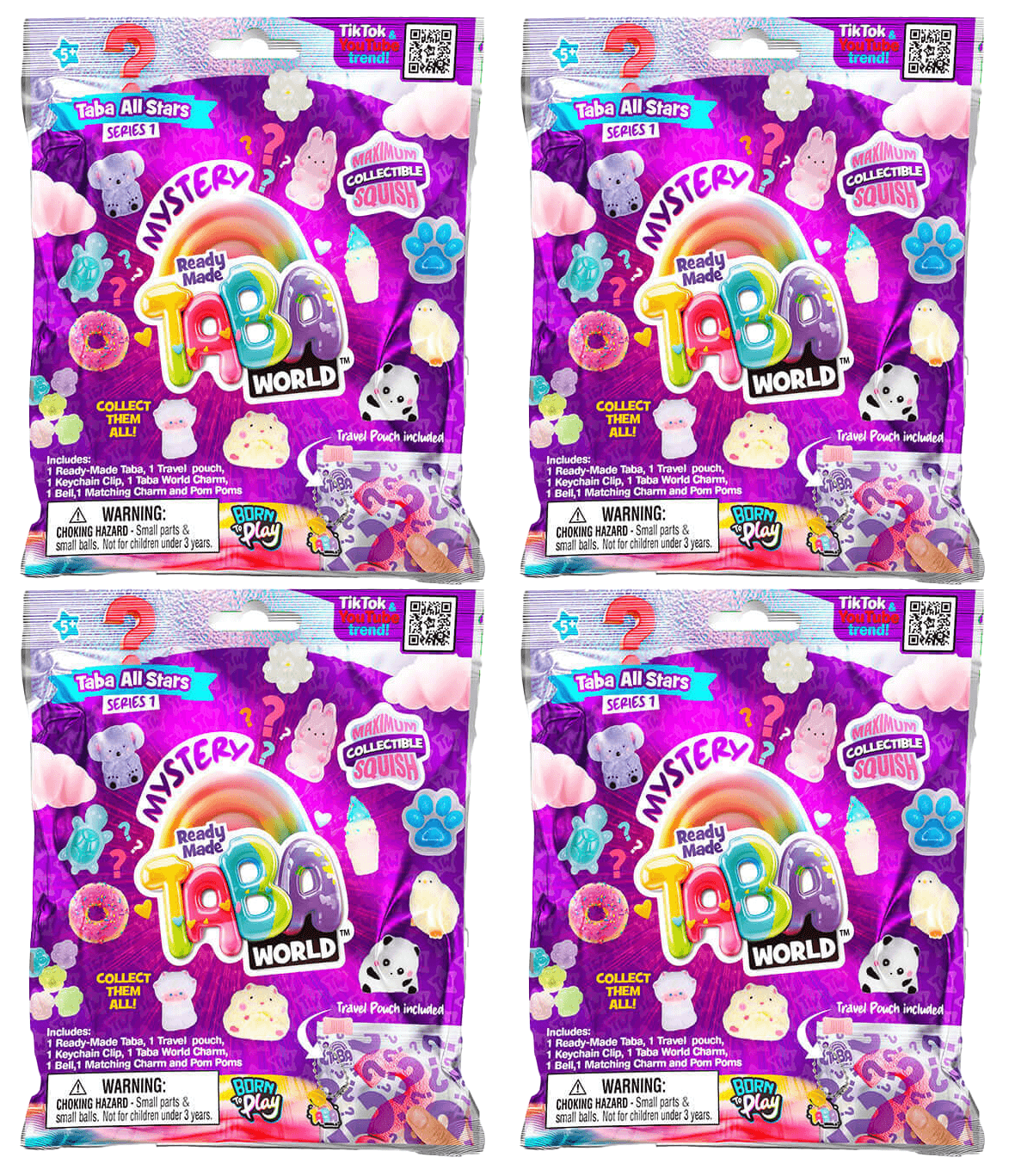 Taba World Ready-Made Mystery Tabas 4 Pack featuring colorful squishies and surprise characters for collectors.