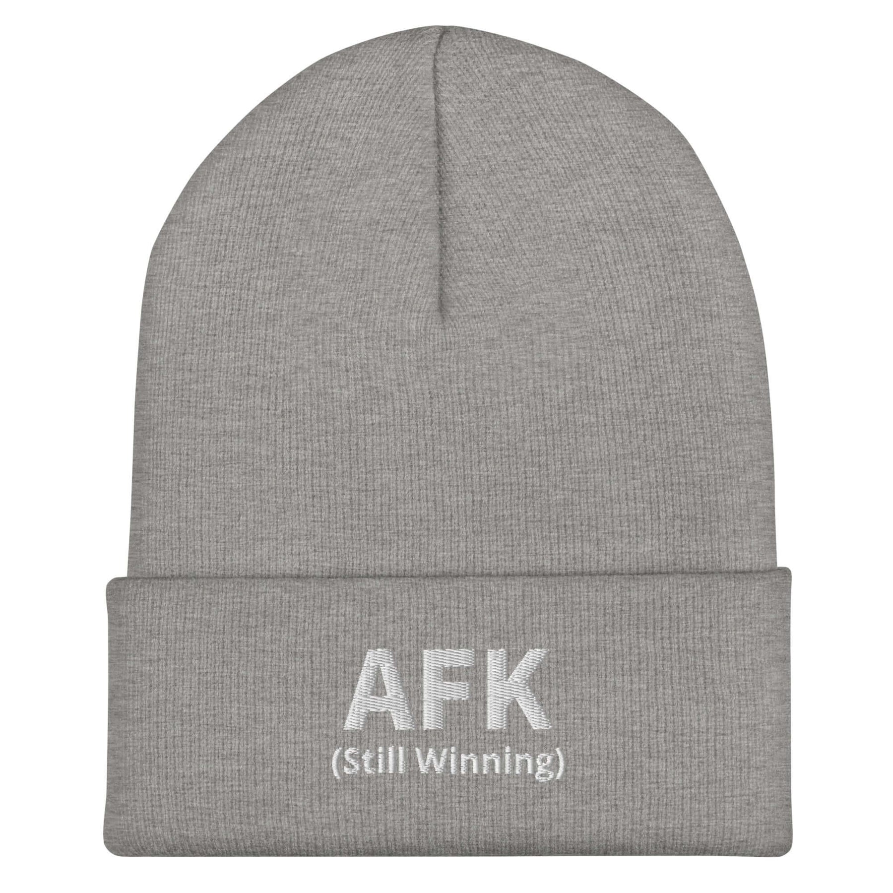 AFK Cuffed Beanie in green with 'AFK (Still Winning)' embroidered text, perfect for warmth and style.